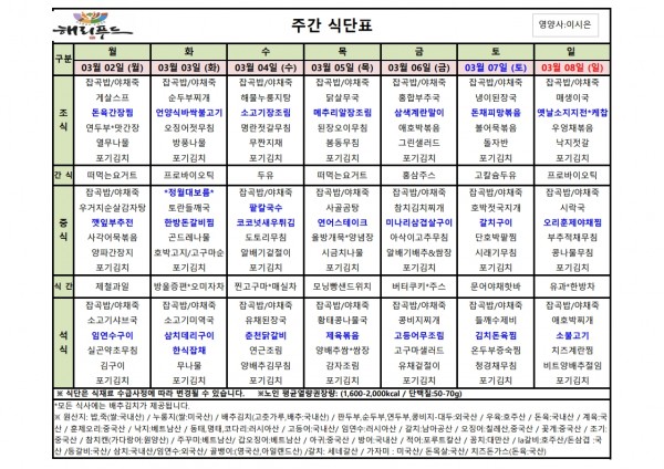 3월 첫째주 식단표 페이지 정보 작성자 은천노인복지회 작성일26-02-27 13:13 조회439회 댓글0건 관련링크 이전글 다음글 목록 답변 본문 2월 넷째주 어르신 식단표 안내해 드립니다. 정성과 영양을 담아 준비하겠습니다. 이전글 다음글 목록 답변