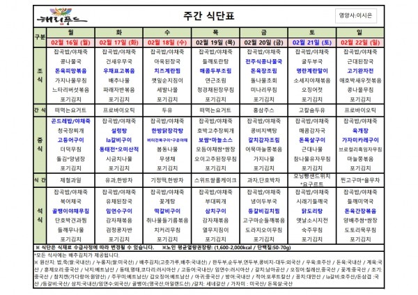 2월 셋째주 식단표 페이지 정보 작성자 은천노인복지회 작성일26-02-12 17:43 조회101회 댓글0건 관련링크 다음글 목록 답변 본문 2월 셋째주 어르신 식단표 안내해 드립니다. 정성과 영양을 담아 준비하겠습니다. 다음글 목록 답변