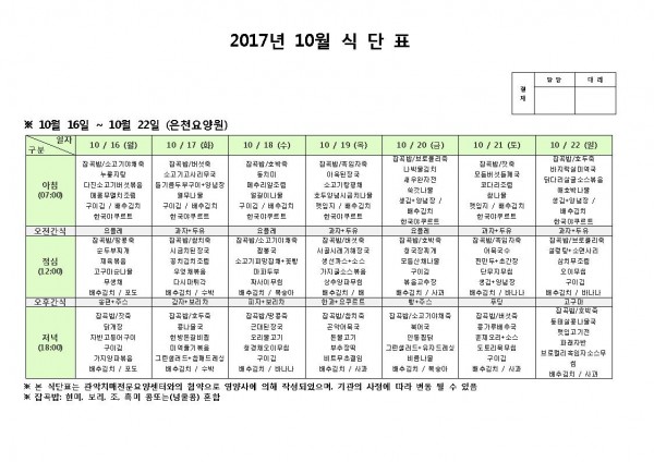 10월 셋째주 식단표 페이지 정보 작성자 은천노인복지회 작성일17-10-17 17:39 조회178,176회 댓글0건 관련링크 이전글 다음글 목록 답변 본문 10월 셋째주 식단표 이전글 다음글 목록 답변