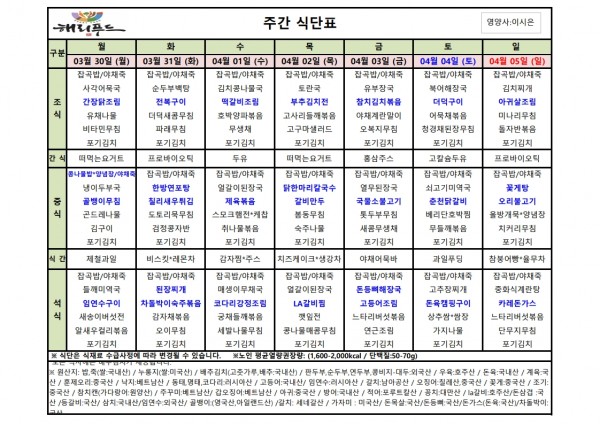 3월 다섯째주 식단표 페이지 정보 작성자 은천노인복지회 작성일26-03-26 17:49 조회606회 댓글0건 관련링크 이전글 다음글 목록 답변 본문 3월 다섯째주 어르신 식단표 안내해 드립니다. 정성과 영양을 담아 준비하겠습니다. 이전글 다음글 목록 답변