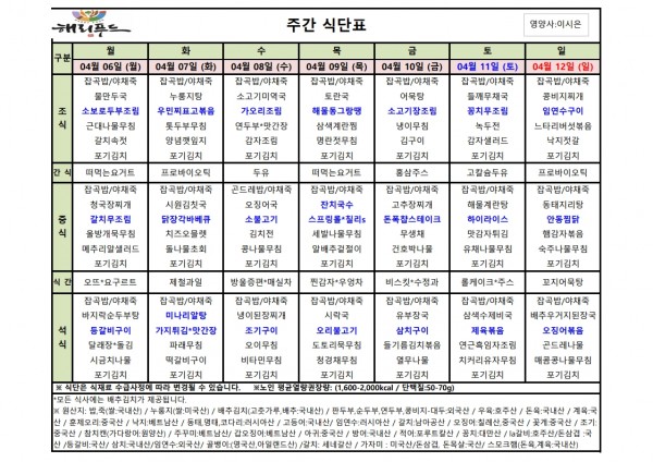 4월 첫째주 식단표 페이지 정보 작성자 은천노인복지회 작성일26-04-03 17:58 조회31회 댓글0건 관련링크 다음글 목록 답변 본문 4월 첫째주 어르신 식단표 안내해 드립니다. 정성과 영양을 담아 준비하겠습니다. 다음글 목록 답변